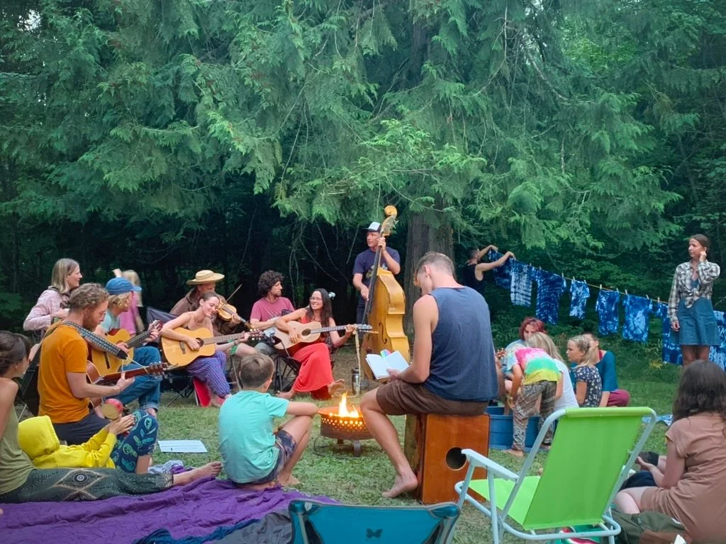 La meilleure façon de vivre l’expérience authentique de Jam Camp est le camping communautaire! Camper ensemble permet de partager les petits hauts et bas de la vie: un magnifique lever de soleil, l’odeur du café du voisin, un chant improvisé à l’heure du dîner, les grillons et les grenouilles la nuit… ou encore le matelas de sol un peu dur, la pluie inattendue, un bébé qui pleure à l’aube — tout cela nourrit la créativité pour composer des chansons! Depuis 23 ans, nous constatons que les participant.e.s s’amusent davantage lorsqu’ils et elles campent ensemble.